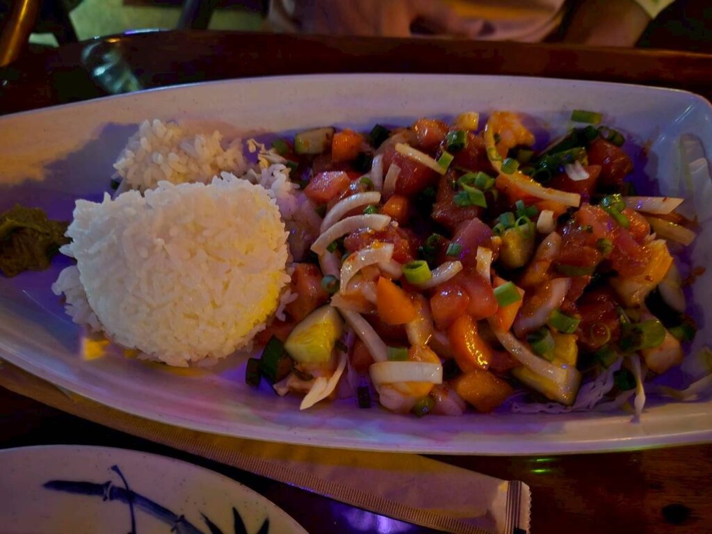 肝心の食事ですが、私Broは大のポケ好きなので、ポケとライスセットをチョイス。こちらのポケは、ピリ辛ですが、味はグッド。