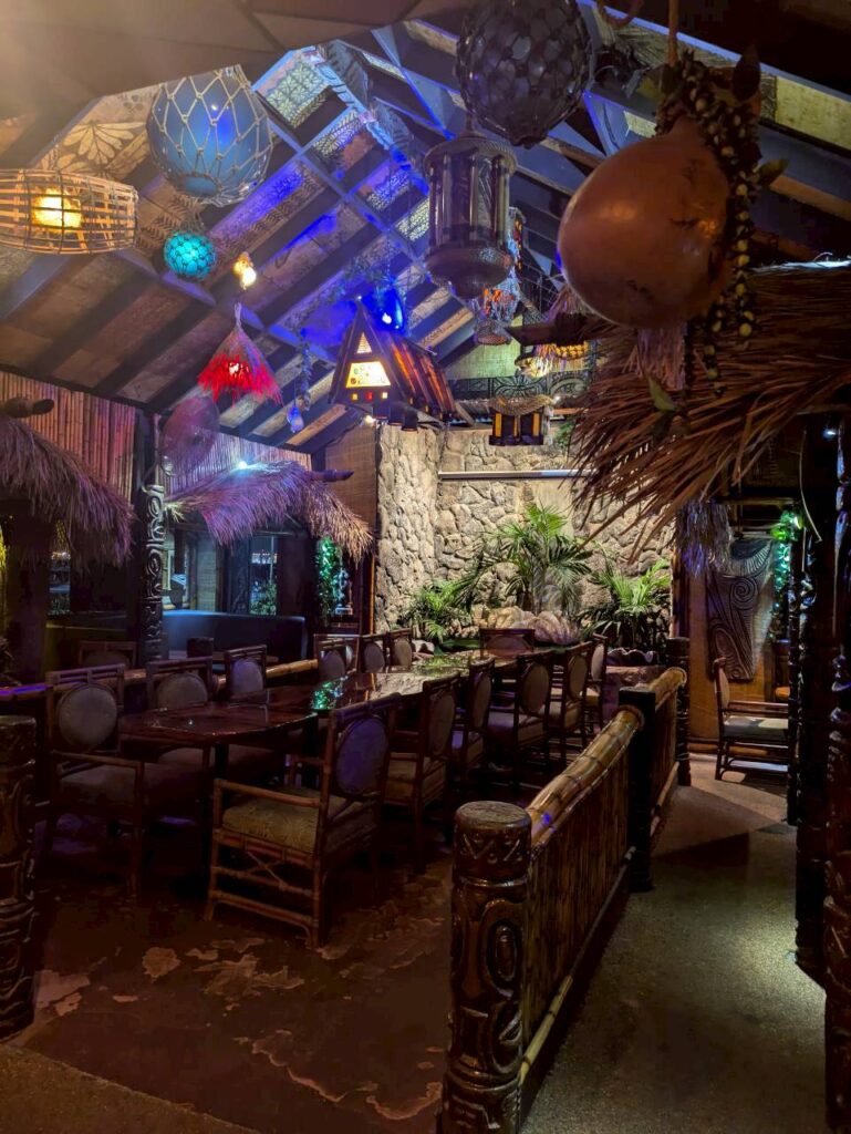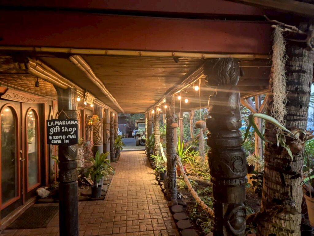 レストランの入り口の表札です。左側に見えている木彫りのオブジェが、そうティキでございます。キッズには、怖い印象を与えてしまうかもしれません。特に夜の時間帯には・・・・・・・・・・・(笑)